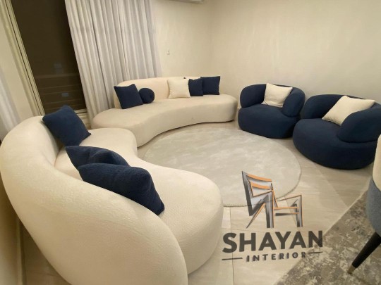 Contemporary curved sofa set featuring smooth, sculptural lines in cream and navy blue upholstery. Includes two rounded cream sofas and two deep blue lounge chairs with matching pillows. A light round rug anchors the arrangement, enhancing the soft, minimalist aesthetic. Ideal for a stylish, cozy, and modern space.