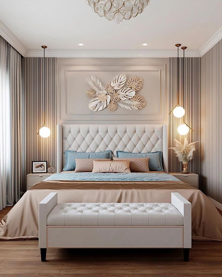 Tufted white bench at foot of the bed with gold stud detailing
